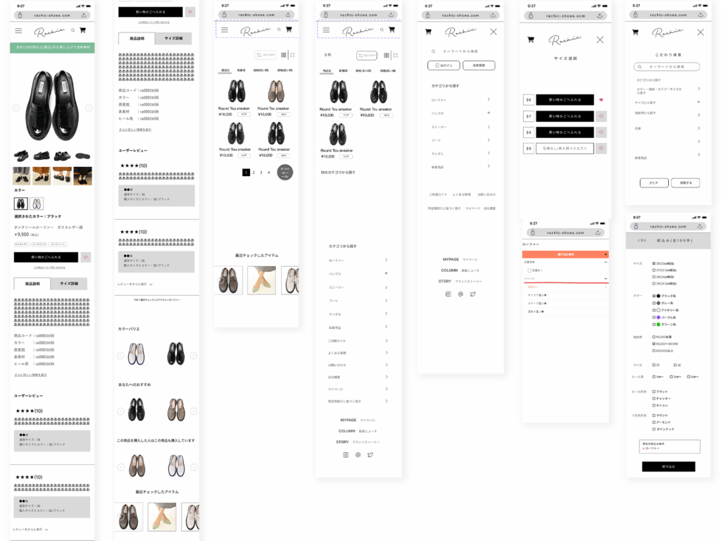 - 備考:カートシステムの機能の制限がある中で、いかにカラーとサイズのバリエーションがある商品を、横スクロールやタブ機能を適宜使用し、最大限に見やすく買いやすくするUI、レイアウトにこだわりました。